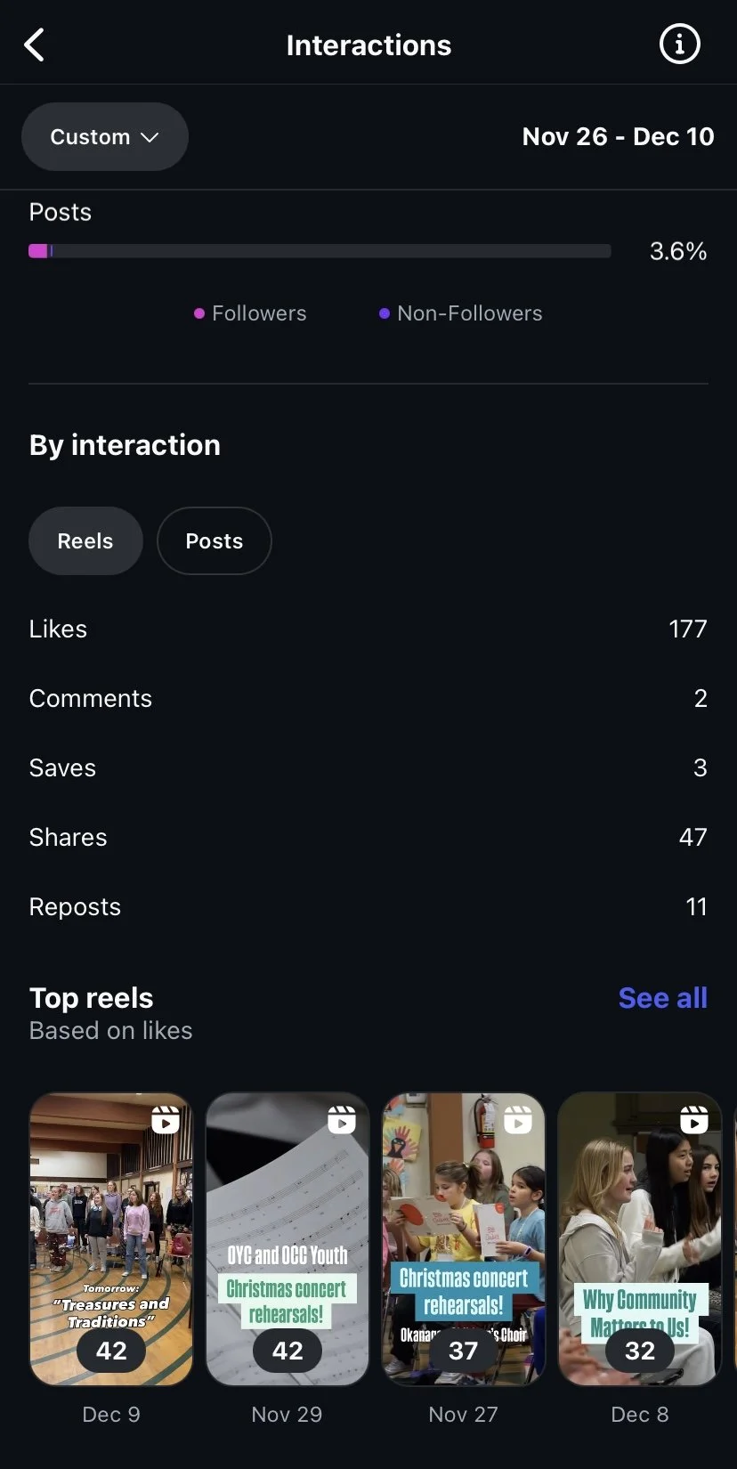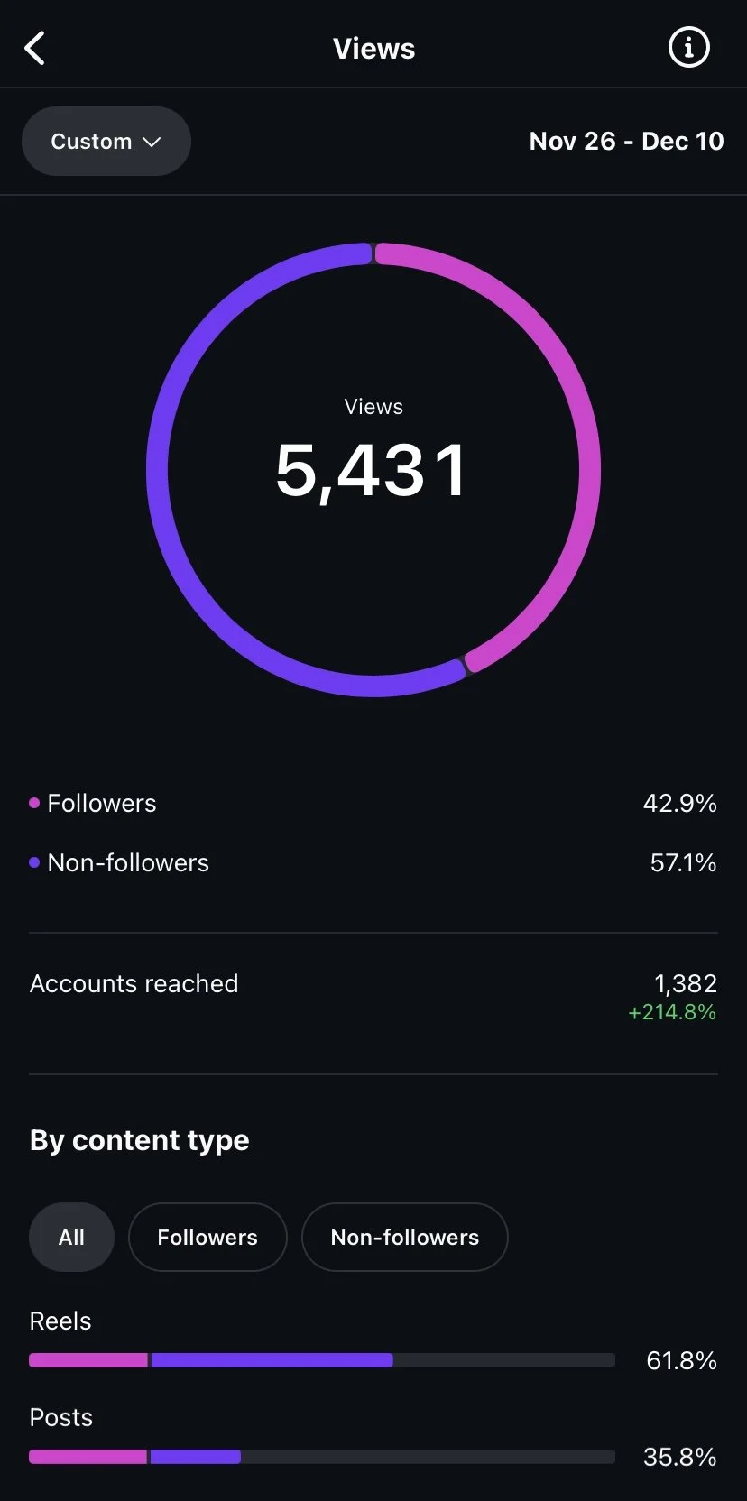 Between November 22nd and December 10th, 2025, the combined content created an outreach of 5.4K views between Facebook and Instagram, and a combination of over 325 new interactions, and 24 new followers.